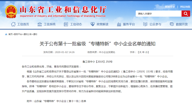 根據《山東省工業和信息化廳關于推薦山東省第十一批“專精特新”中小企業的通知》(魯工信中小〔2019〕153號)要求,經各市推薦,第三方機構評審,并經公示無異議,認定我公司山東興田陽光智能裝備股份公司為山東省第十一批“專精特新”中小企業。