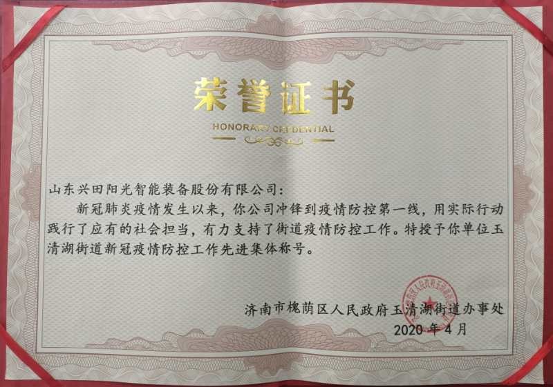 我公司——山東興田陽光智能裝備股份有限公司,因在新冠肺炎疫情防控工作中表現突出,被槐蔭區玉清湖街道評為“新冠肺炎疫情防控工作表現突出的先進集體”,并被授予“抗‘疫’先鋒團隊”榮譽稱號。
