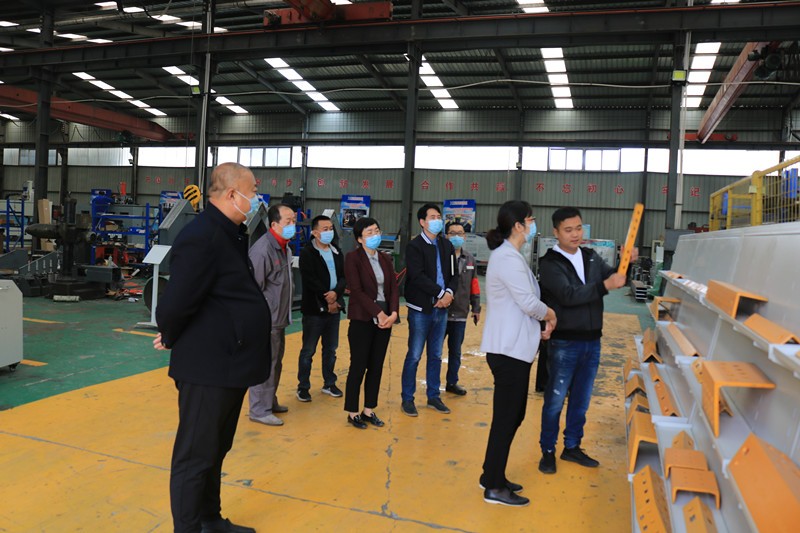 逯明書記一行首先來到了生產車間,現場考察企業在常態化疫情防控下的復工復產情況和面臨的困難。在裝配調試區,逯書記詳細了解了一拖二全自動口罩機、高速數控角鋼鉆孔生產線、新型高速數控角鋼沖孔打字剪切生產線等設備的裝配調試情況和生產過程中遇到的困難。